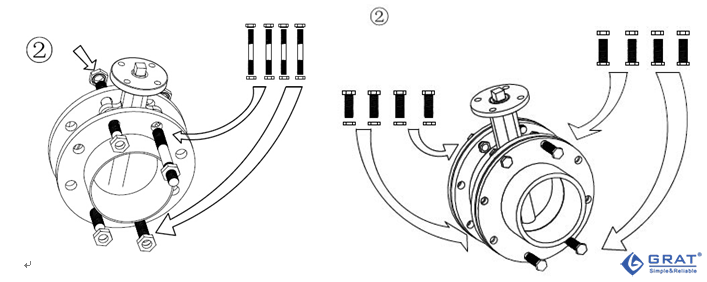 2.2.2 按圖示將兩端螺栓螺母分別輕輕插入兩端對(duì)應(yīng)的法蘭孔(法蘭式蝶閥需調(diào)整墊片位置),將螺母稍加擰緊以校正法蘭面的平面度;