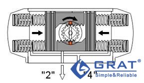 在氣源壓力經(jīng)過(guò)電磁閥換向后,氣缸的兩活塞在彈簧的彈力下向中間方向移動(dòng),中間氣腔的空氣從氣口(2)排出,同時(shí)使兩活塞齒條同步帶動(dòng)輸出軸(齒輪)順時(shí)針?lè)较蛐D(zhuǎn)。(如果把活塞相對(duì)反方向安裝,彈簧復(fù)位時(shí)輸出軸變?yōu)榉聪蛐D(zhuǎn),即為單作用反轉(zhuǎn))